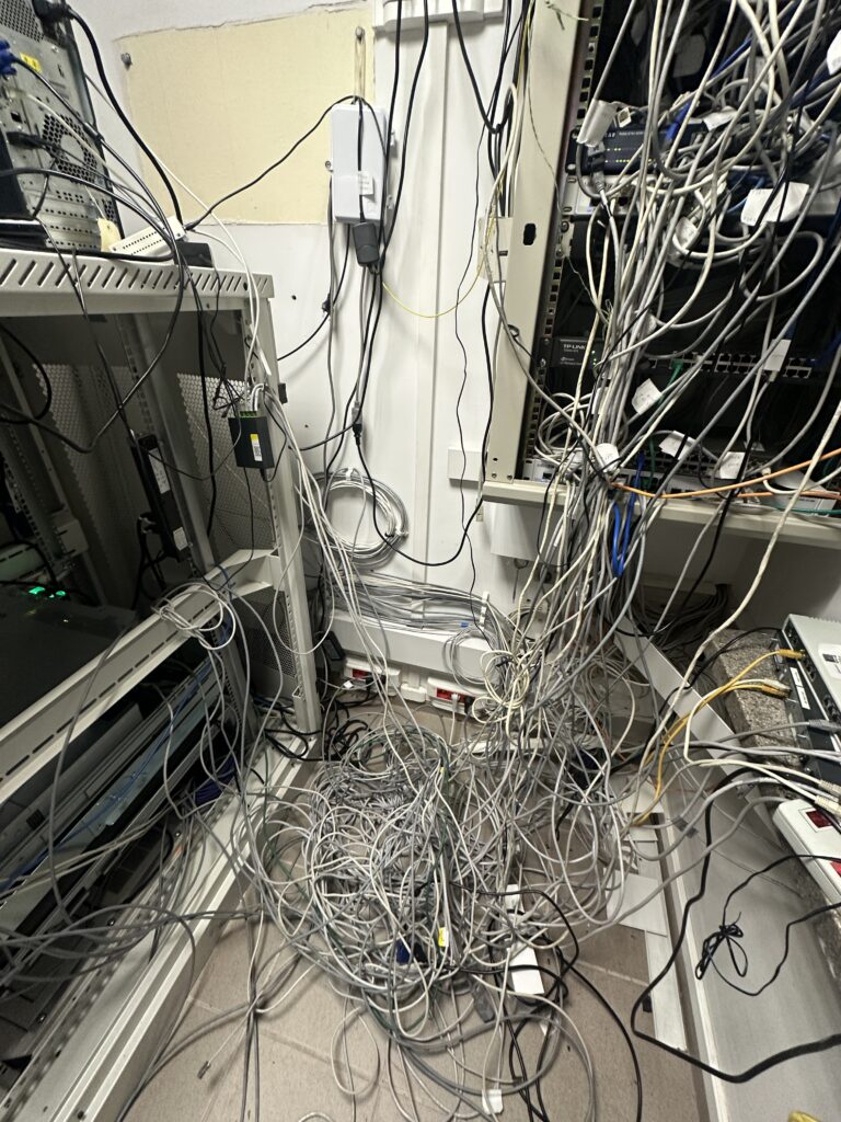 Każde zlecenie zaczyna się od diagnozy. Tym razem na miejscu zastaliśmy coś, co można opisać tylko jednym słowem - chaos. Kable wszędzie, brak oznakowania, przewody leżące na podłodze i szafa, której nikt nie odważył się dotknąć od lat.
